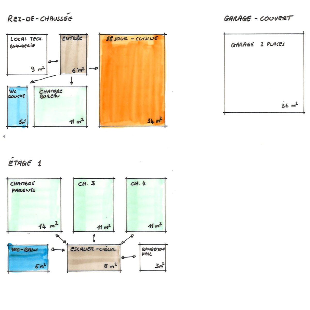 Les intentions de projet sont partagées au moyen de croquis, d’esquisses et de représentations sensibles, réalisées notamment à l’encre ou à l’aquarelle. Ces supports favorisent l’échange et permettent une compréhension progressive du projet.