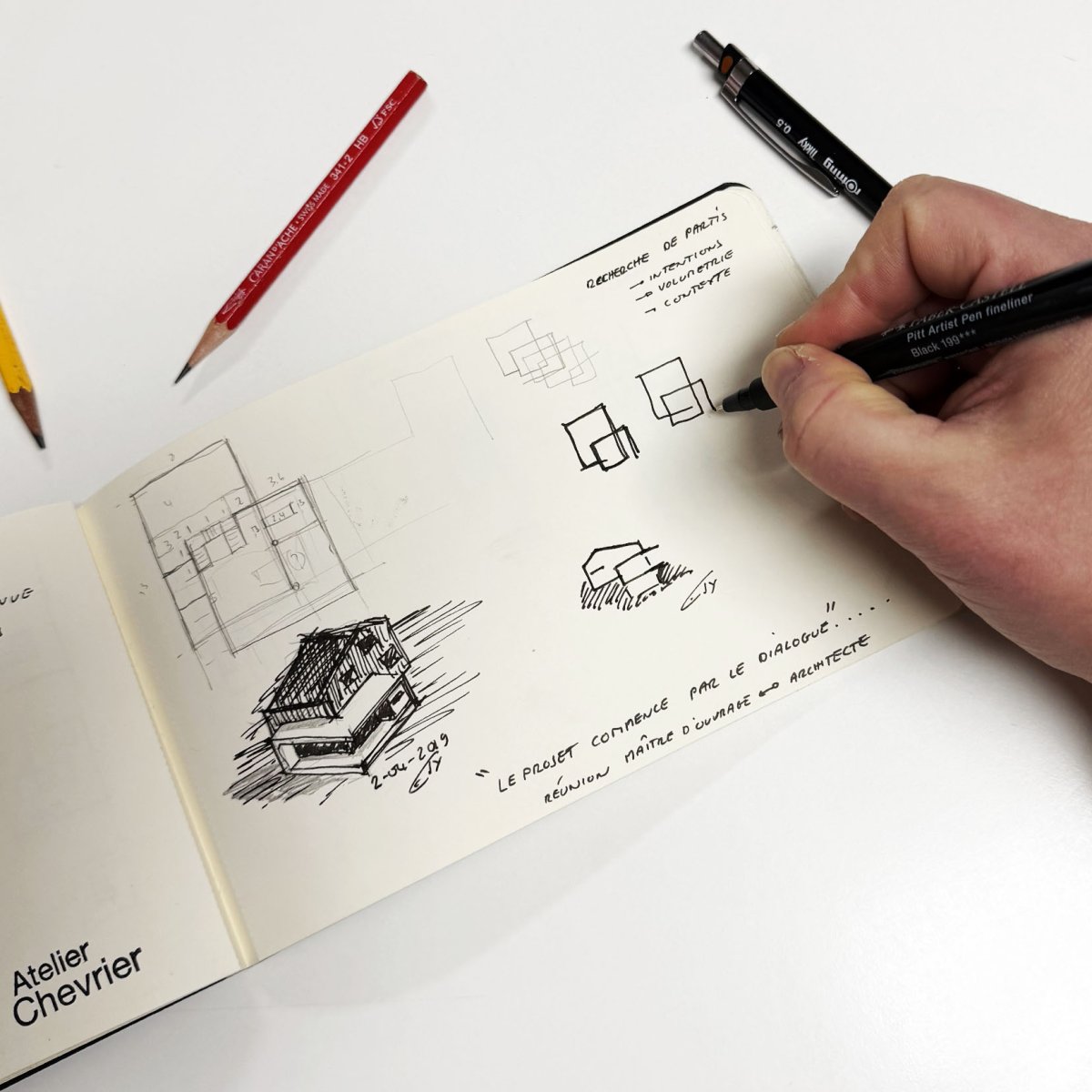 Par l’esquisse et le dessin à la main, le projet se construit progressivement, révélant les volumes, les proportions et les relations au site, et affirmant une intention architecturale claire.