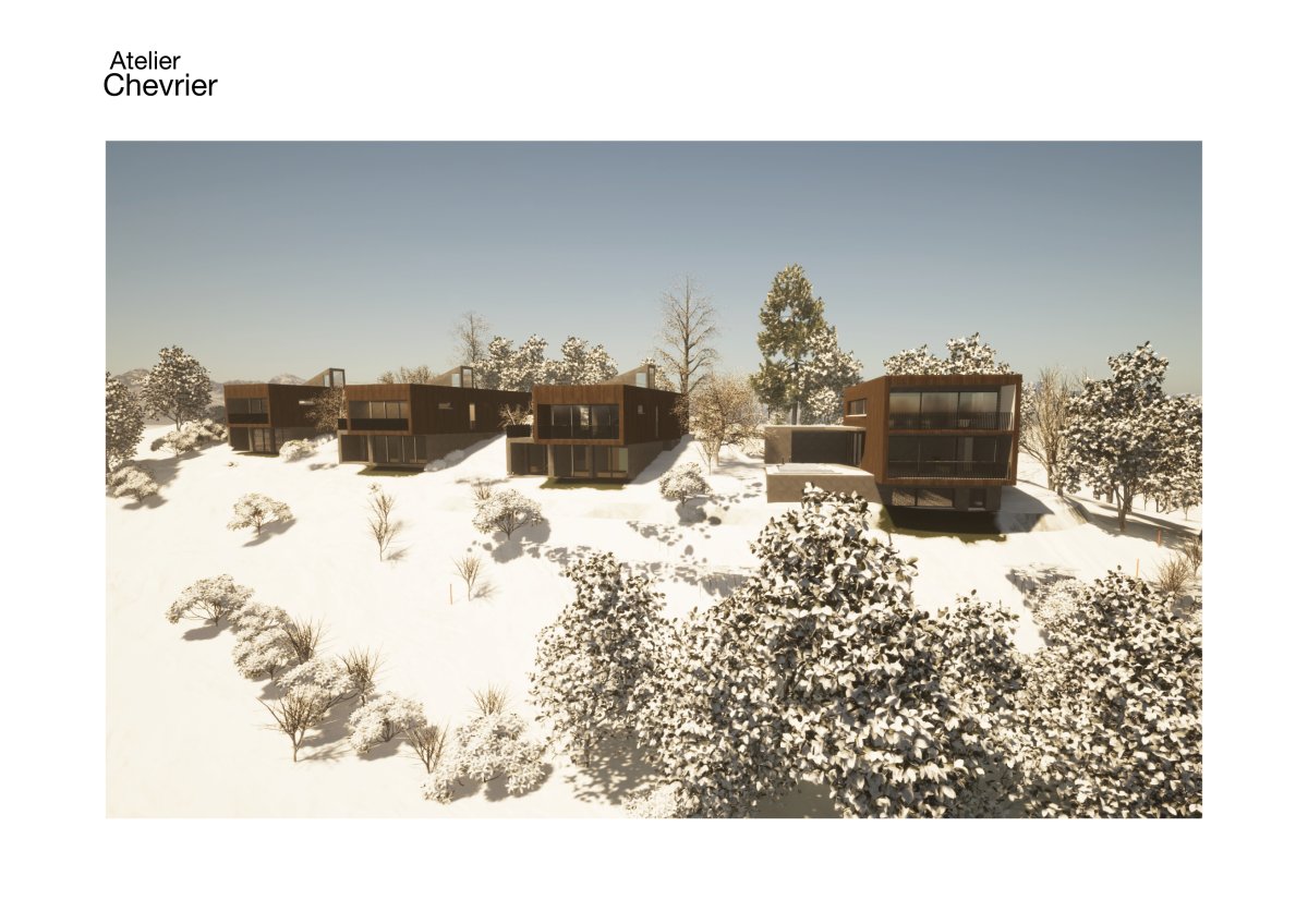 Vue d’ensemble du projet de quatre villas individuelles intégrées au site naturel sur un promontoire à Grimisuat–Ayent, Valais.