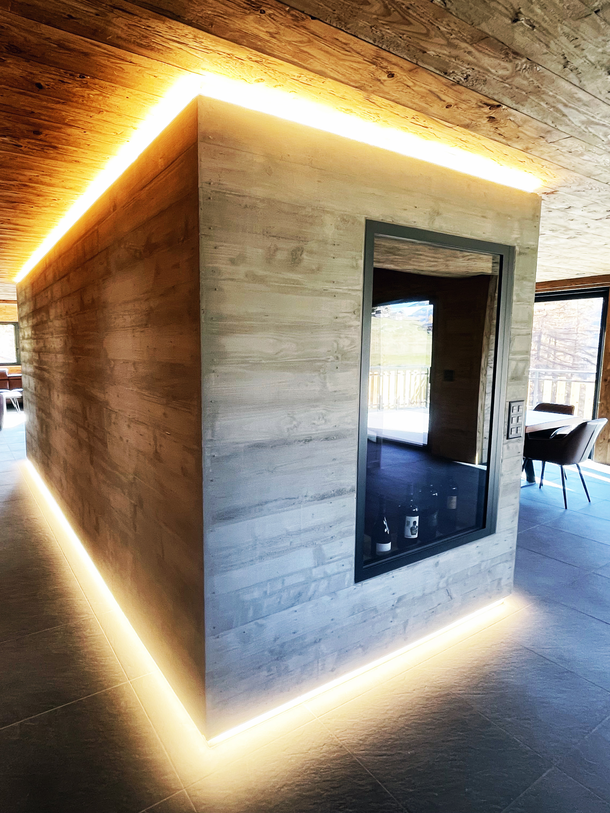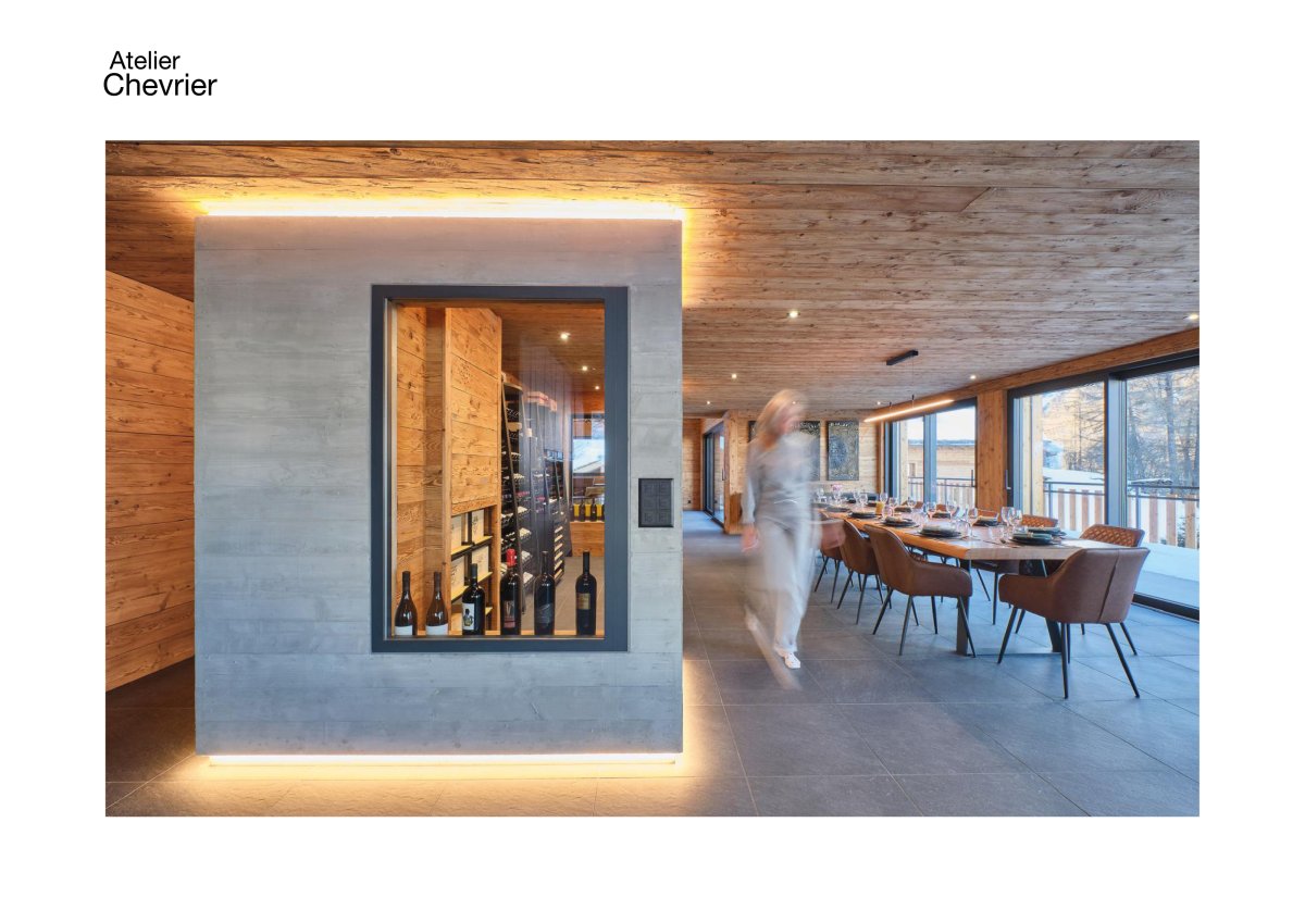 Salle à manger avec cave à vin en béton apparent dans une maison individuelle en bois à La Sage, Évolène, Val d’Hérens, Valais.