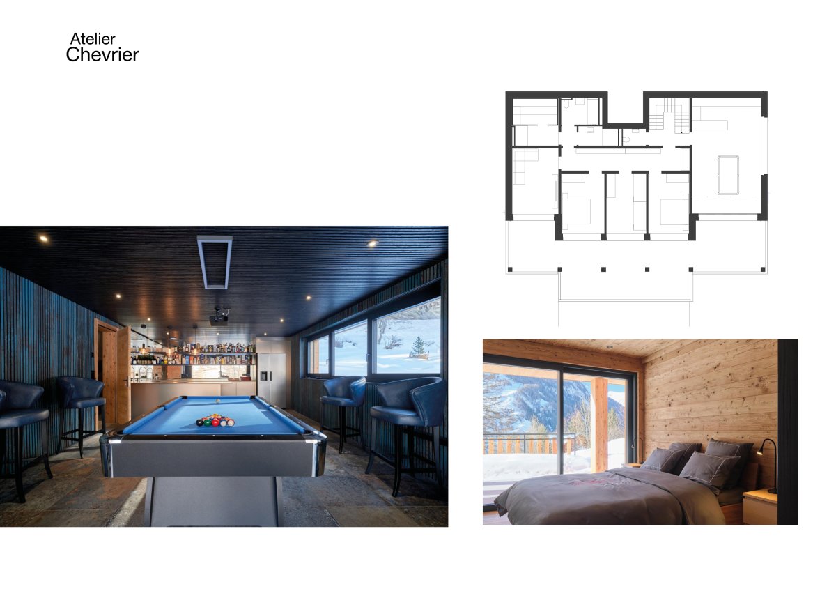 Rez inférieur d’une maison individuelle à La Sage comprenant salle de jeux, billard, bar et espaces de nuit, architecture intérieure en matériaux bruts.